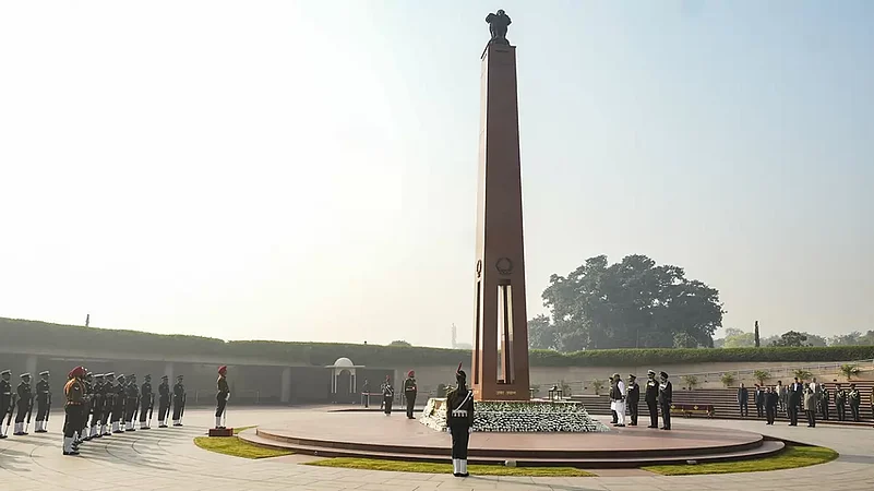 Defence Minister Rajnath Singh with Chief of Defence Staff General Anil Chauhan, Chief of Army Staff General Manoj Pande, Chief of Naval Staff Admiral R. Hari Kumar and Vice Chief of Air Staff Air Marshal Amar Preet Singh paid tribute at the National War Memorial on the occasion of Vijay Diwas, in New Delhi.