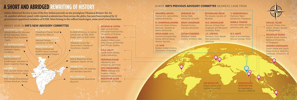 It is the Indian Historical Review, among the few Indian journals which are a part of the prestigious Thomson Reuters list, that is bearing the brunt of these shenanigans. Five of the new ICHR team have been made members of the journal’s editorial board; the remaining 13 have taken over its advisory committee. Historically, committee members have been distinct from council members, to enable objective and independent opinion. The previous 24-member committee comprised illustrious historians like of Romila Thapar, Mushirul Hasan, Irfan Habib, at least 10 reputed academics from foreign universities and others from across the country, the aim being to have rigorous peer review and enable the members to commission promising historians to write on various subjects of interest. Now, says Delhi University professor and former council member B.P. Sahu, “the Review is almost an inhouse journal of the council. With all its members on the editorial board, it is no longer accountable to anyone.”
