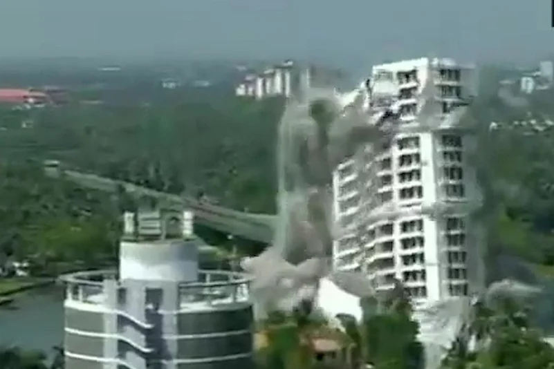Two high-rise apartment complexes were brought down through controlled implosion method as authorities began implementing a Supreme Court order to demolish four illegal water-front structures at Maradu municipality, in Kerala's Kochi city on Saturday.