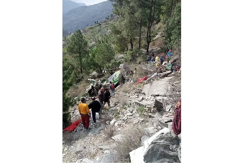 The bus was severely damaged and those who reached the spot informed that survivors were in shock and unable to recollect the moments when the bus skidded off the mountainous road.