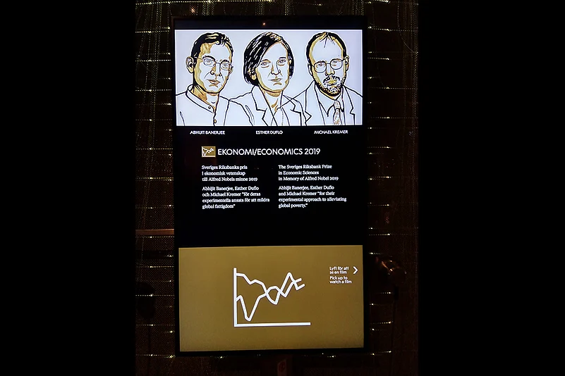 A digital board showcasing Abhijit Banerjee, Esther Duflo and Michael Cremar, this year's Nobel Prize winners in economics. (Photo: Mirza Arif Beg)