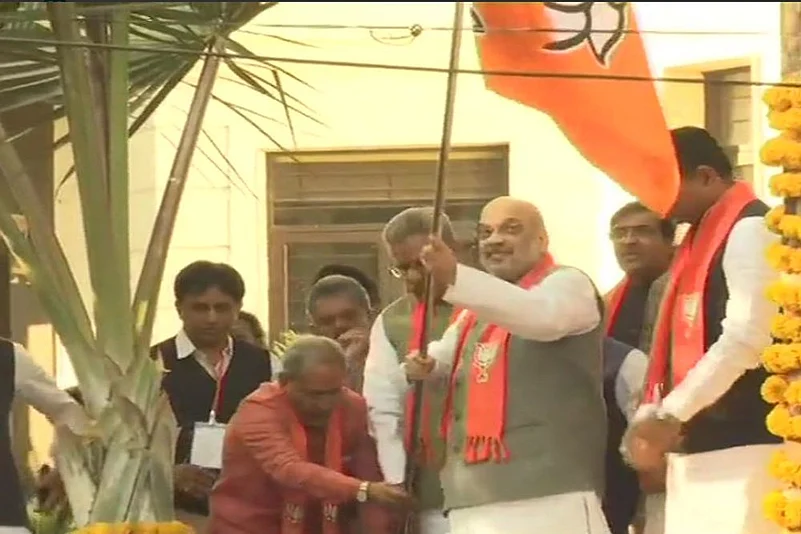 BJP president Amit Shah on Tuesday launched "Mera Parivar, Bhajapa Parivar" campaign by hoisting the party flag at his residence in Gujarat. The campaign seeks to unfurl party flags at five crore houses as part of the drive ahead of the announcement of the schedule for Lok Sabha polls.