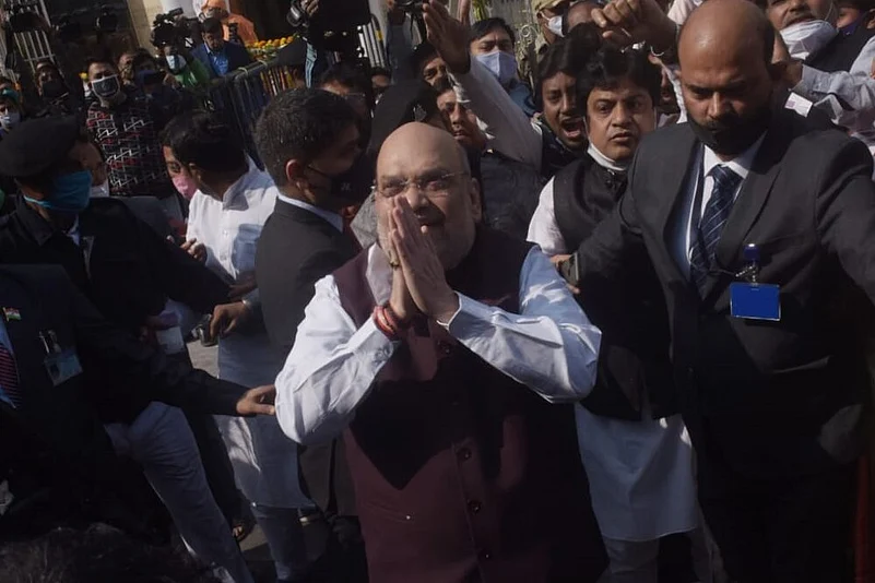 Amid beats of the dhaak, Shah arrived at Vivekananda's ancestral home in Simla Street that has been turned into a museum. Members of the BJP women's wing, donning traditional white saree with red borders, welcomed him by showering flower petals.