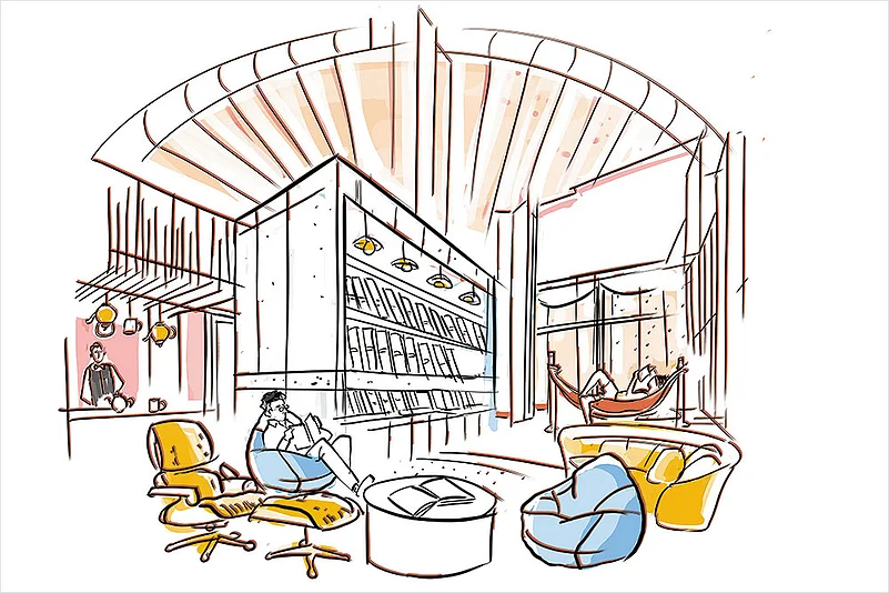 As an outsider to this city, without much money and a ramshackle home, I find myself suddenly living it up in a posh hotel. Although I don’t eat too much, all my food and living costs are paid for. I breathe life into the lounge, by having created a library filled with an eclectic collection of books, bean bags, hammocks, divans and Eames chairs. My close friends who visit me regularly I entertain either in the coffee shop, at Tinello’s, the Italian restaurant or sometimes even at the new Japanese restaurant adjacent to the lounge, whose name I keep on forgetting. The manager and I have become great friends. We have, in fact, converted the coffee shop into a luxury chaiwallah ki dukaan. From the ceiling, which is considerably high, hang tin tea pots and clay cups for dramatic effect.