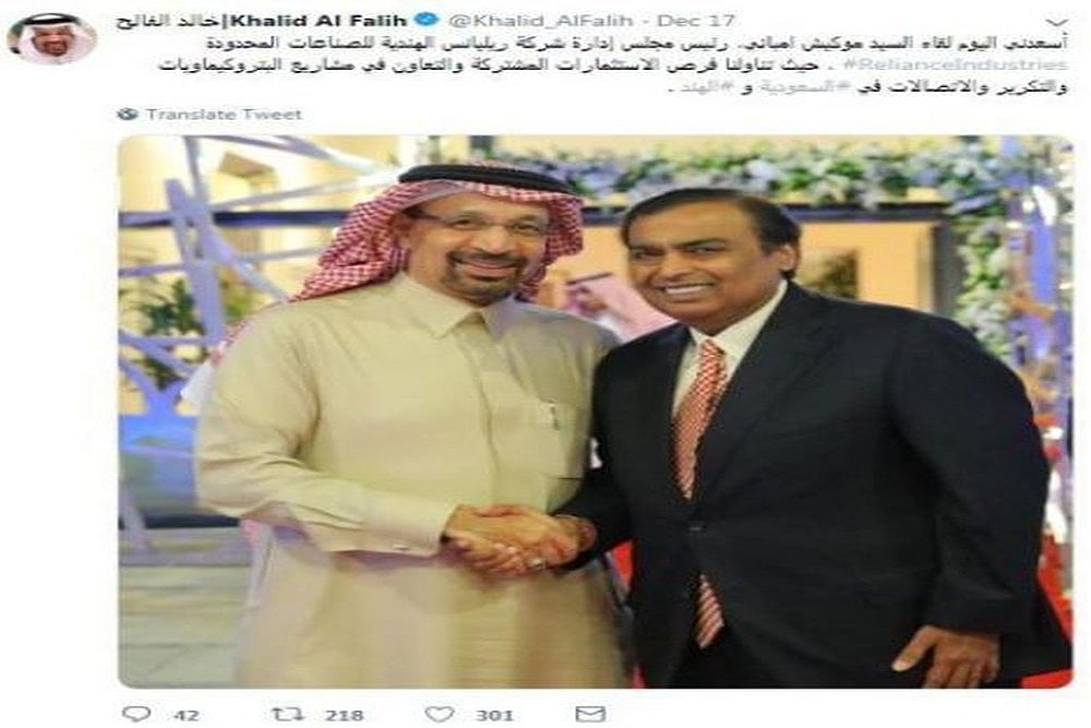 Al-Falih, who has known Ambani for over a decade now, travelled to Udaipur that month to attend the pre-wedding festivities of Ambani's daughter, Isha's marriage with Ajay Piramal's son Anand.