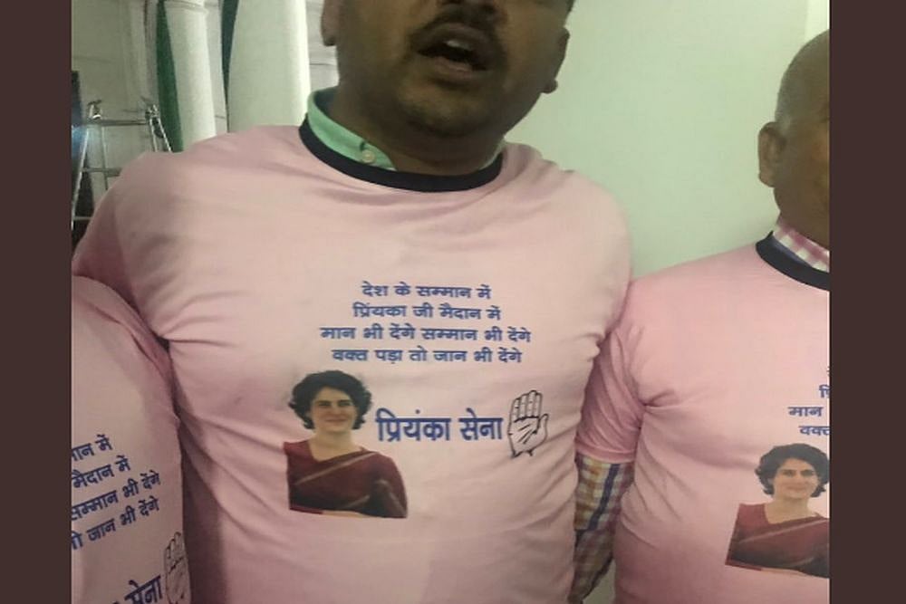 “Desh ke samman mein, Priyanka ji maidan mein, Maan bhi denge, samman bhi denge, waqt padega toh jaan bhi denge (To honour the country, with Priyanka Gandhi in the field, we will give our respect and if required we will even lay down our lives),” says the slogan on the pink T-shirts, which has a photo of the Congress leader too.