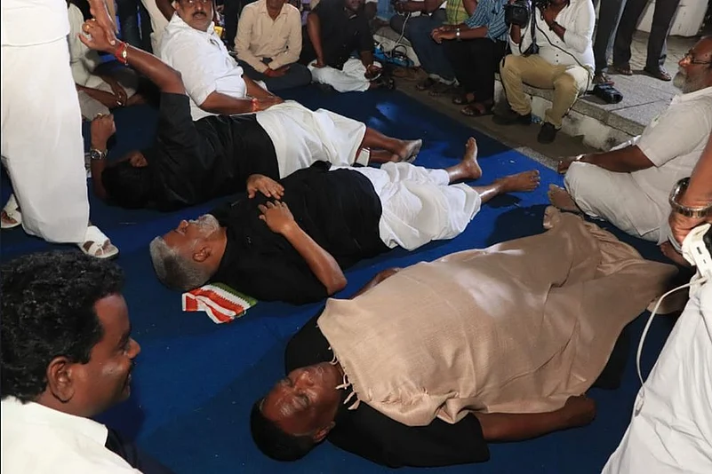 The Puducherry Chief Minister and his ministerial colleagues along with legislators of Congress and its allies have been staging a dharna outside the Lt Governor's office since February 13.