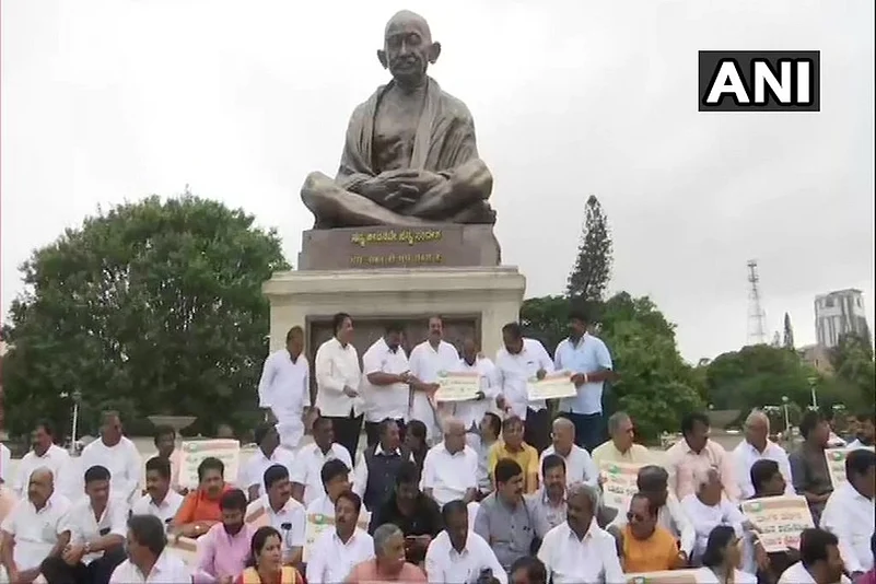 BJP's protest comes a day after Congress leaders, including AICC General Secretary K C Venugopal and Congress Legislature Party leader Siddaramaiah, staged a 'dharna' in front of the Gandhi statue, accusing the saffron party of trying to "destabilize" the state government by "undemocratic" means, using money and political power.