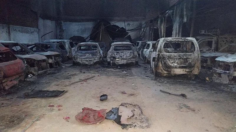 A torched car parking area in Shiv Vihar. (Photo: Aritry Das)
