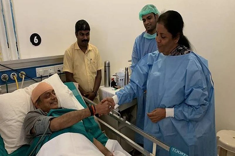 Defence Minister Nirmala Sitharaman Tuesday called on Congress leader Shashi Tharoor, who is in hospital after suffering head injuries while performing a ritual at a temple in Thiruvananthapuram.