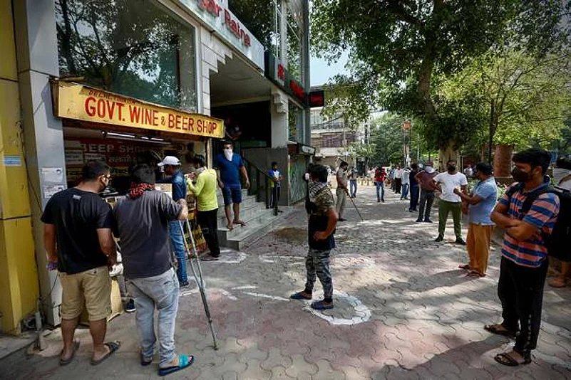 The Delhi government allowed sale of liquor from Monday. The rates of liquor were raised by 70 per cent of maximum retail price on Tuesday. Still large crowds gathered at the shops, violating social distancing norms amid the coronavirus outbreak.