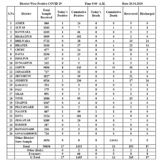9:31AM: 17 new COVID-19 positive cases reported in Rajasthan so far - 1 each in Ajmer, Banswara & Nagour, 2 each in Jhunjhunu, Jodhpur & Kota and 8 in Jaipur. Total of positive cases in the state rises to 1495. Total 24 deaths and 205 recovered in the state: Rajasthan Health department.