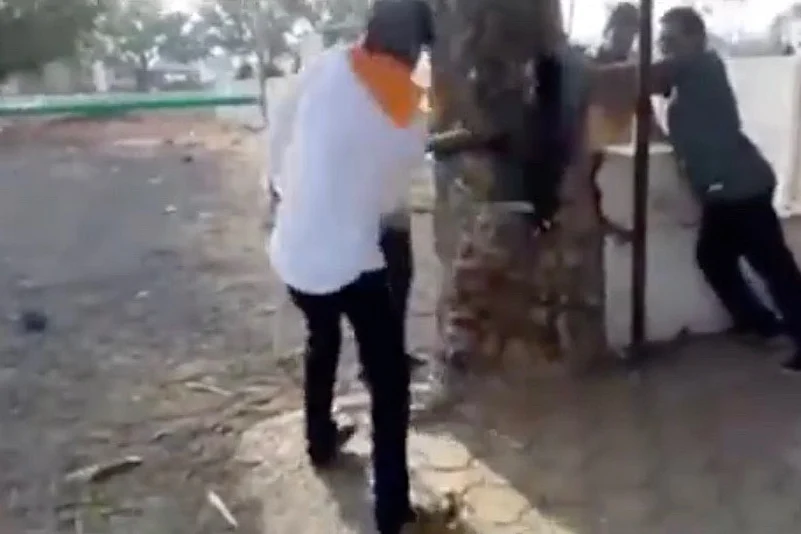 The two men were forced to stand against a tree and beaten with thick wooden sticks. One of the men was then forced to hit his wife repeatedly with a slipper and shout "Jai Shree Ram", as video footage of the incident that has gone viral shows.