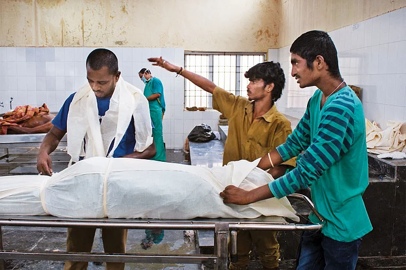 In India, the reality of this process is shockingly different from our perception. In almost all hospitals in India, a range of tasks, sometimes even the opening of the torso with the Y-incision, is done by semi-literate staff, all of them Dalits. Official identity cards designate the men as “sanitary workers.” Much like other stigmatised work in a society organised by caste, such as handling all manner of waste (including human excreta), the cleaning of sewers or skinning of animal carcasses, this modern work too has become hereditary. The ill-equipped workers, with outmoded refrigerators and crude implements, perform tough tasks under dismal conditions. They suffer from several occupational ailments and work-related infections from handling the decomposed, verminous bodies. Tasked with endowing dignity on the dead, they face a social death. The untrained, underpaid Dalits cannot tell their friends and neighbours what they do for a living.