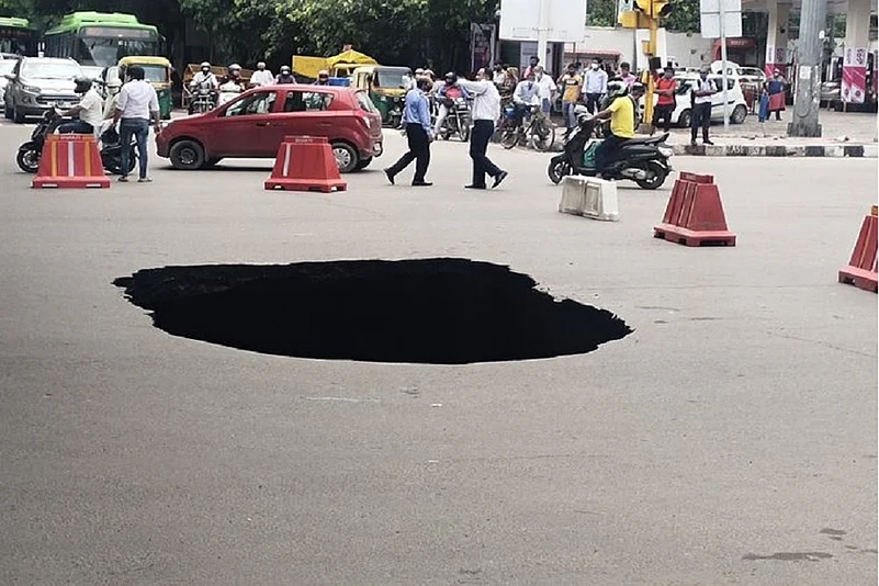 A huge portion of a road under IIT-Delhi flyover caved in due to heavy rains in the national capital.