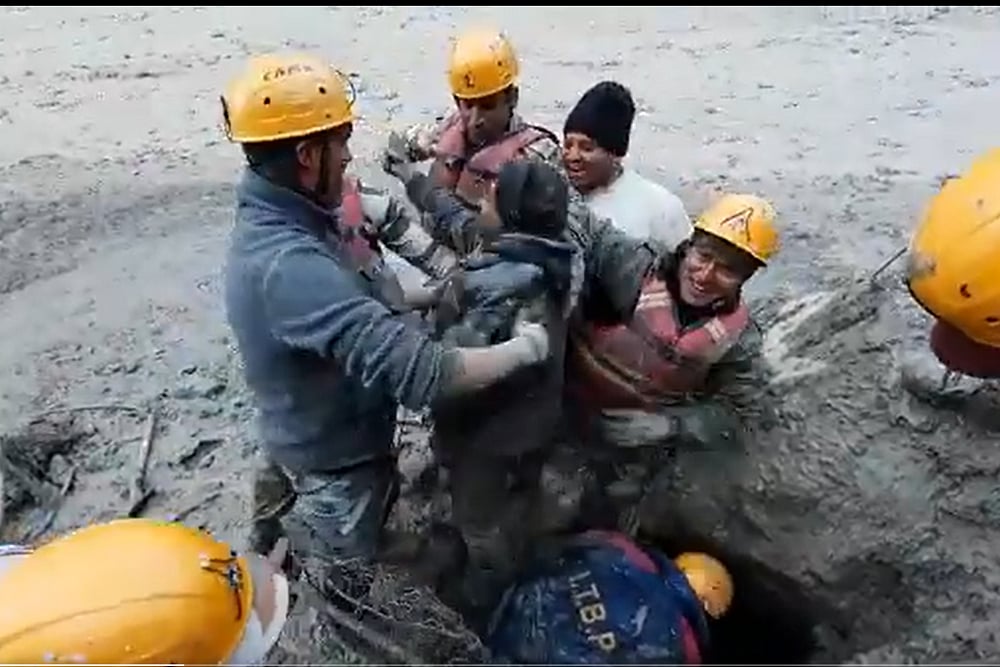 Completely swept away by the flash floods, several men covered in mud were safely pulled out from a slush-covered tunnel by ITBP personnel in the Tapovan power project area.