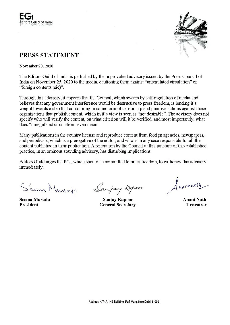 The Editors Guild Of India (EGI) on Saturday said that it is “perturbed” by the recent advisory from the Press Council of India (PCI), and urged for its withdrawal.