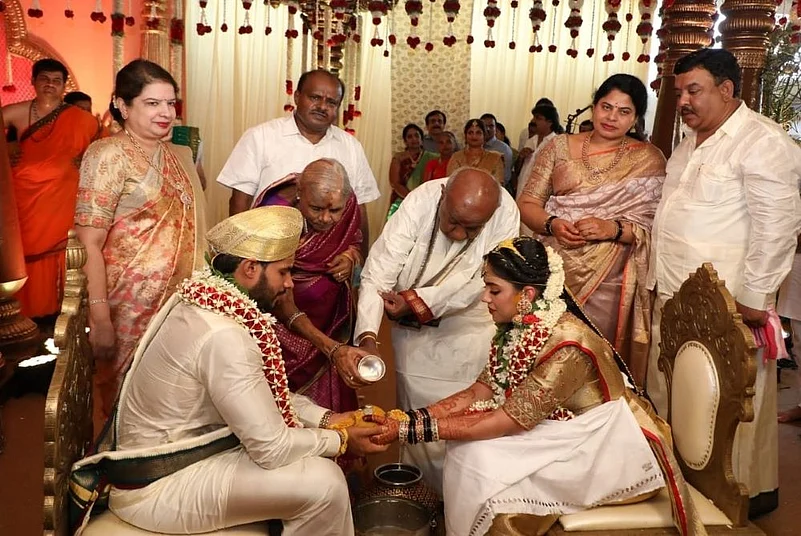 The wedding saw a comparatively low-key ceremony with the family forced to shelve grand plans in view of the COVID-19 lockdown. Only close family members will attend the marriage to be held at a farmhouse in nearby Ramanagara district, the JD-S leader had said.