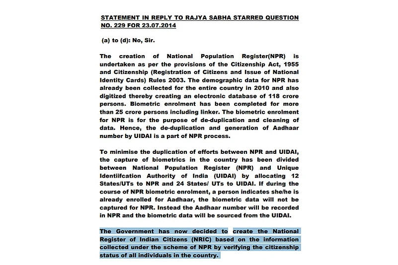Rijiju reiterated the link between NRC and NPR again in November 2014 in a written reply to Dr. T.N.Seema in the Rajya Sabha.