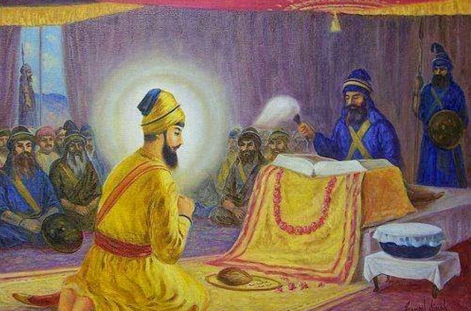 Guruji joined the Khalsa Panth after his Sikhs by kneeling before them and asked them to in turn initiate him as a member, on an equal footing with them in the Khalsa, thus becoming the sixth member of the new order.