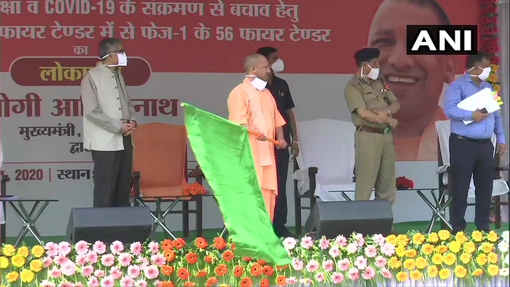 Uttar Pradesh Chief Minister Yogi Adityanath on Wednesday flagged off fire tender vehicles to be used for sanitisation purpose in 66 tehsils of the state.