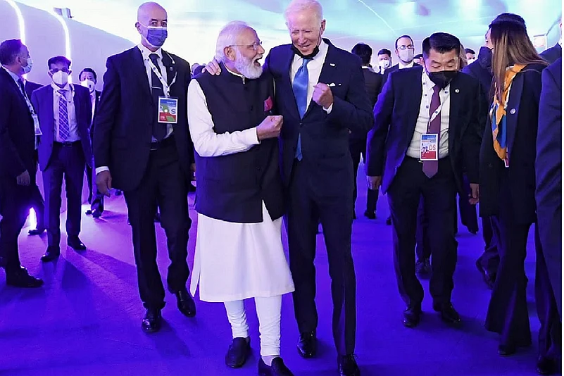 In the pictures, Modi is seen walking with Biden in a half embrace, apparently sharing a light chitchat. The two leaders are seen happy to be in each other's company.