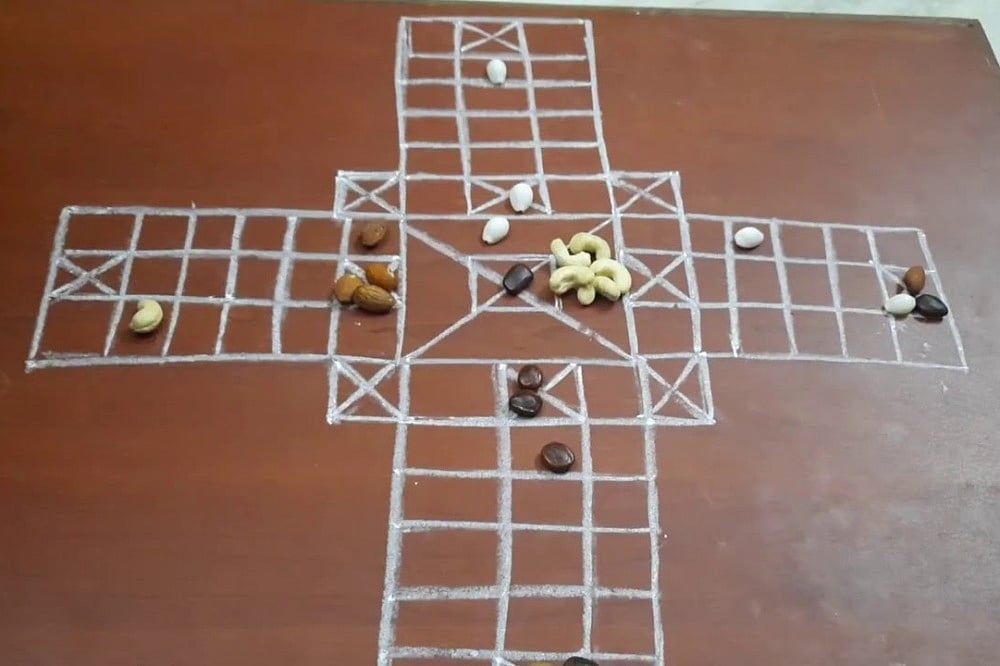 Dhayam (or Dhayakattai) is a Tamil village game in which small sea shells or stones are moved on geometric patterns drawn on sand or paper after a throw of dice decides the move.