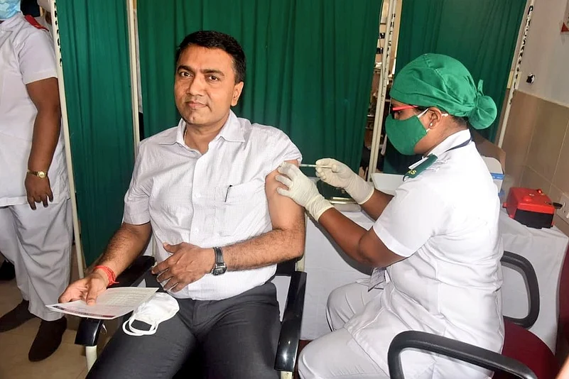 Goa Chief Minister Pramod Sawant took his first dose of vaccine against Covid-19 at a primary health centre near in Goa on Wednesday.