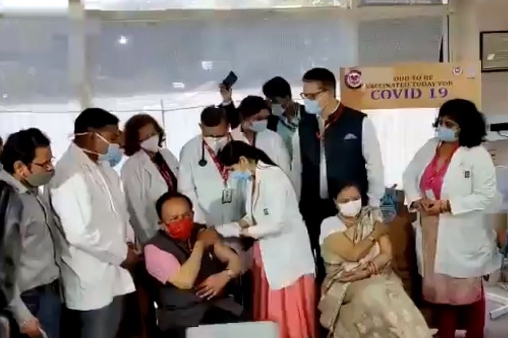The minister's wife Nutan Goel first took the Covid-19 jab, followed by Harsh Vardhan