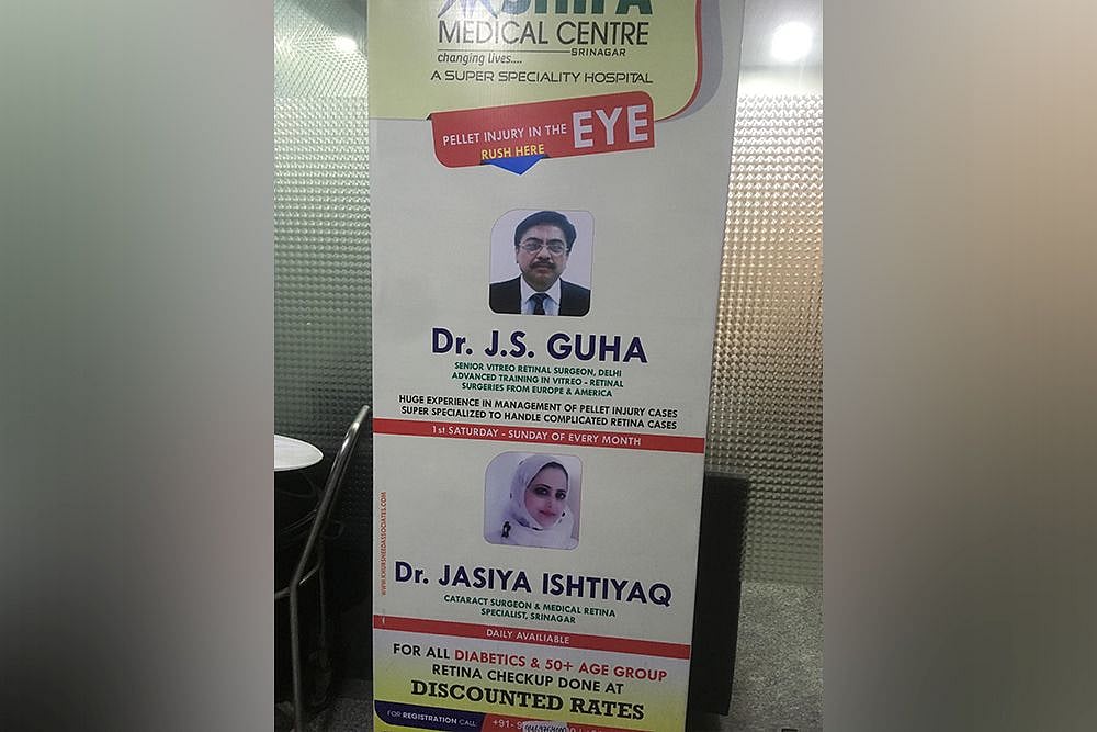 The advertisement, put up at Shifa Medical Centre in Srinagar, describes the visiting doctors as experienced in treating patients with pellet injuries. The hospital management says the doctors see, on a daily basis, around 25 pellet-blinds.