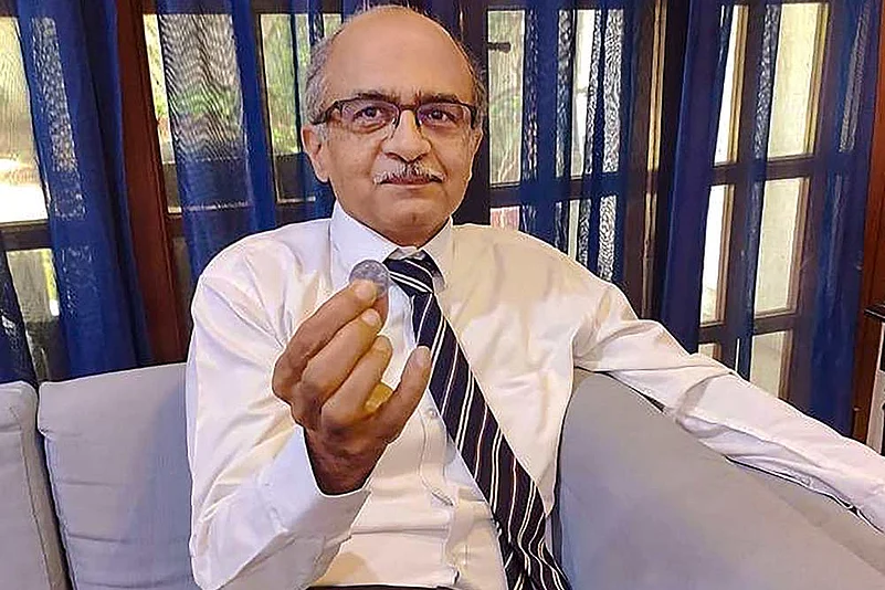 Bhushan Tweeted a photo from his social media account writing " My lawyer & senior colleague Rajiv Dhavan contributed 1 Re immediately after the contempt judgement today which I gratefully accepted".