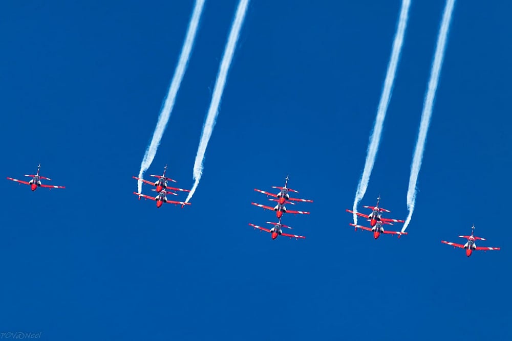 Later, it was time to paint the sky red and white as a nine-aircraft Suryakiran Aerobatic Display team ripped through it performing synchronous aerobatic maneuvers for 15 minutes straight.