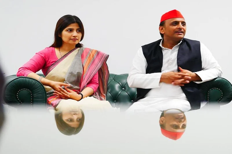 Former Uttar Pradesh Chief Minister Akhilesh Yadav with his wife Dimple Yadav at party office in Lucknow. (Picture credit: Senthil Chengalvarayan)
