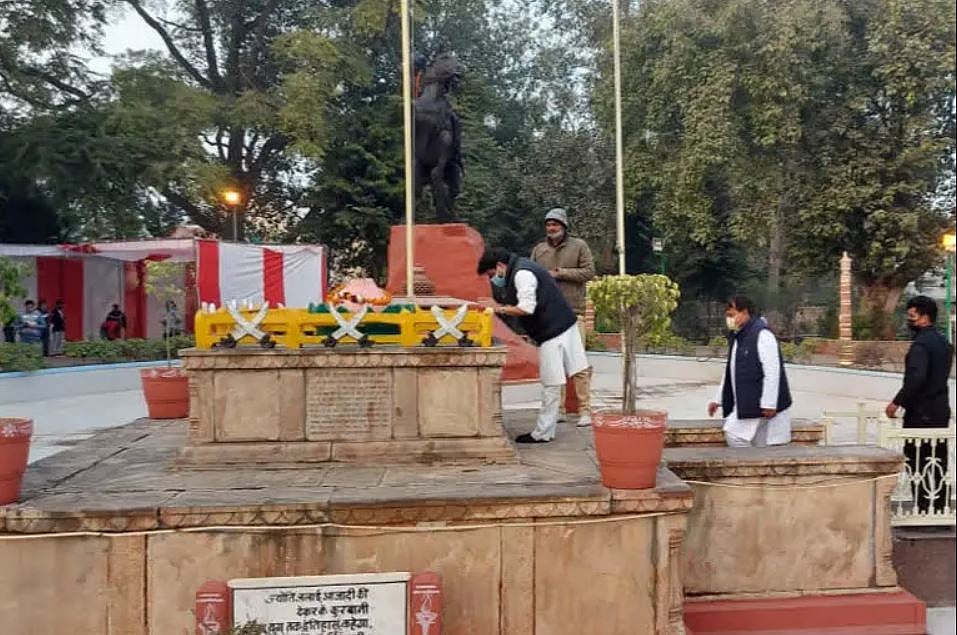 The civil aviation minister, who quit the Congress last year and joined the BJP, paid floral tributes and bowed before the warrior queen of Jhansi, who laid down her life fighting Britishers in 1858.