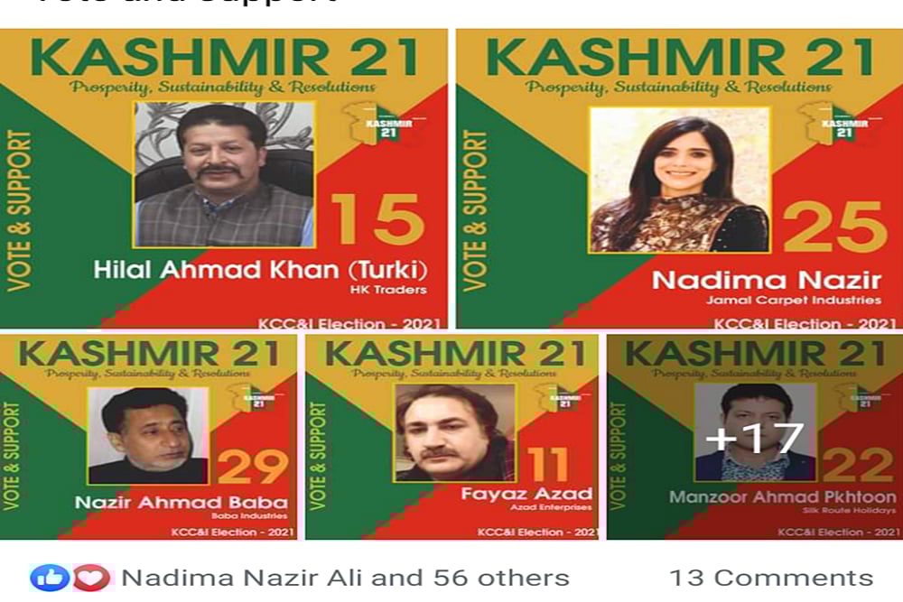 A lone woman member contesting the polls, Nadima Nazir, who represents Kashmir 21, said being an integral part of the Valley and doing business here, seeing it evolve and persevere even after multiple challenges over the past three decades, proves a very imperative point --- the people, the business, the industry --- have weathered the worst that could have been thrown at them and still have the drive in them. “We as a people are extremely diligent and always have a forward-looking attitude and with this idea, we are contesting the polls,” she said. “It is this attitude which needs to be given stimulus to revive what is troubled and take forward the optimism that we all have in us in Kashmir,” she said.