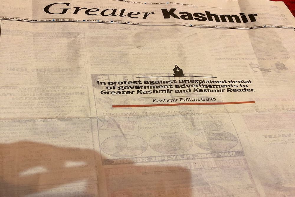 The Kashmir Editors' Guild (KEG) had claimed last month that the state government had stopped giving advertisements to two major local dailies -- Greater Kashmir and Kashmir Reader.