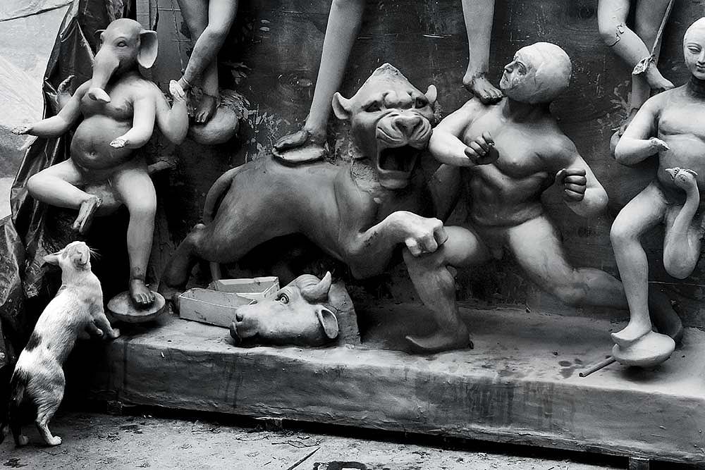Pottery, as every archaeologist would agree, is a building block of civilisation. Along with arrowheads and numismatic evidence, shards of clay are signs of ancient endeavour. In a culture where religion is embodied in idolatry, there is an unbroken line of tradition in the fine art of modelling clay figures of gods. If goddess Durga, who emerges from her mountain abode with her children in early autumn for a few days amongst earthly devotees, represents the grand panoply of the divine family, Calcutta is the city where she gets the most fulsome homage through numerous offerings. To shape, then animate with near-life, idols for 4,000 Durga Pujas in the city, the expert artisans of Kumartuli toil for months. There, along the Hooghly in north Calcutta, in narrow, mud-splattered lanes and tarpaulin-walled workshops are fashioned the enraged agony of Mahishasura, the snarling lion, the fierce-eyed majesticity of Durga and the beatific Lakshmi, Saraswati and Kartik.