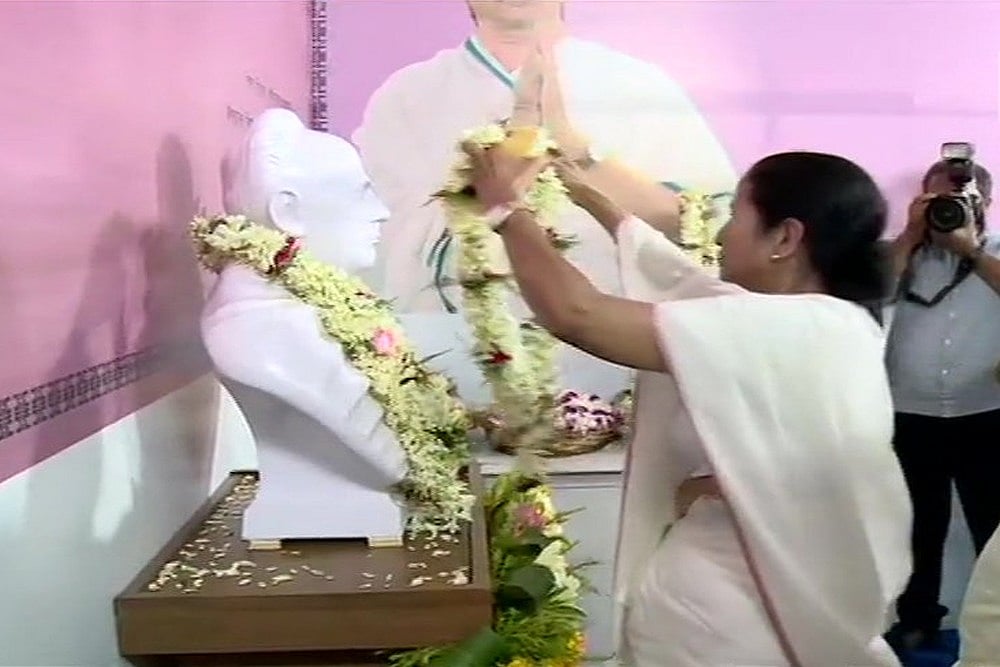 West Bengal Chief Minister Mamata Banerjee Tuesday installed a new bust of 19th century social reformer Iswhar Chandra Vidyasagar at the college where an old one was vandalised during a roadshow of BJP president Amit Shah last month.