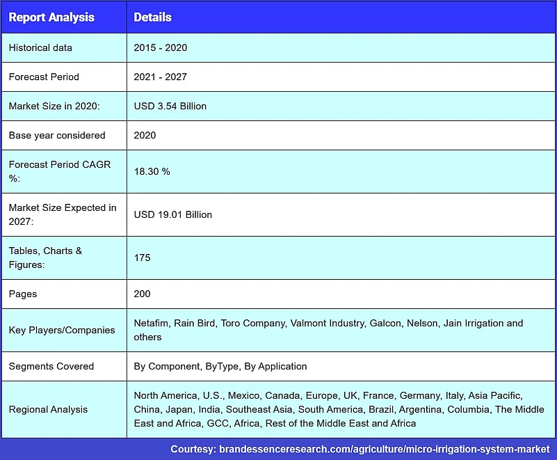 The study “Micro Irrigation System Market is valued at USD 3.54 Billion in 2017 and expected to reach USD 19.01 Billion by 2027 with a CAGR of 18.3% over the forecast period”, was published by Brandessence Market Research this month (April 2021).