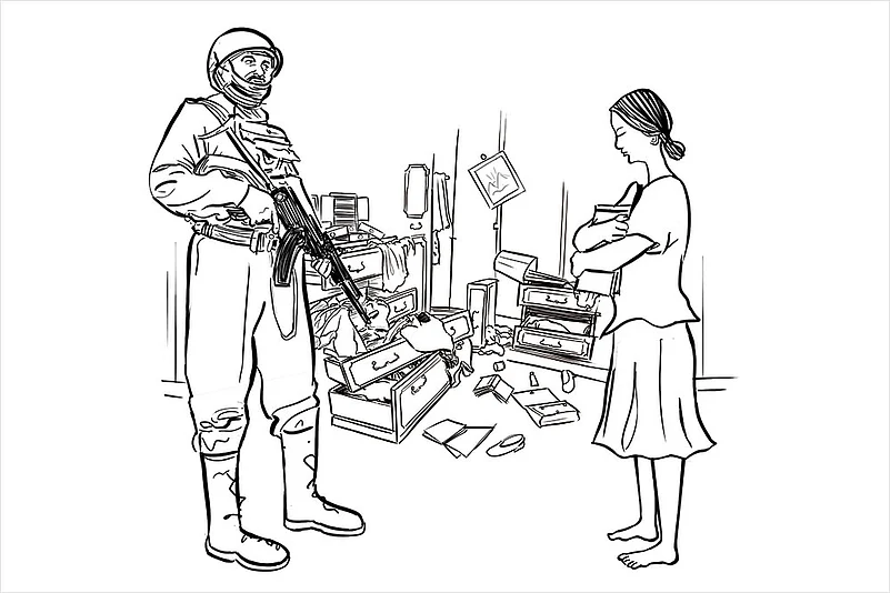 So there she was in the room she shared with an older girl who worked in their home—she was 14—when two soldiers walked in. They told her, in Hindi, not to be alarmed as they searched the room. Then they searched her body, saying they were just checking, all the while telling her, don’t be scared, nothing will happen. It was only after they left, having turned the whole house inside out and finding nothing, that the household members managed to shake themselves out of fear and come to check on her. It was enough time for her to straighten out her clothes. It wasn’t rape so I never said anything, she told me. When she finally made her own house 40 years later, she made sure every room had a door with a sturdy bolt.