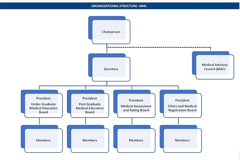 The Chaudhary committee had suggested an organogram placing NMC on the top and four boards under it. The Medical Advisory Council (MAC) was shown as a separate body parallel to the NMC.