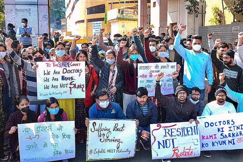 Large-scale protests have been held by resident doctors of various hospitals under the banner of the Federation of Resident Doctors' Association (FORDA) in Delhi and other parts of the country over a delay in the NEET-PG counselling, which has been postponed due to the Centre deciding to revisit the criteria for the determination of the EWS quota.