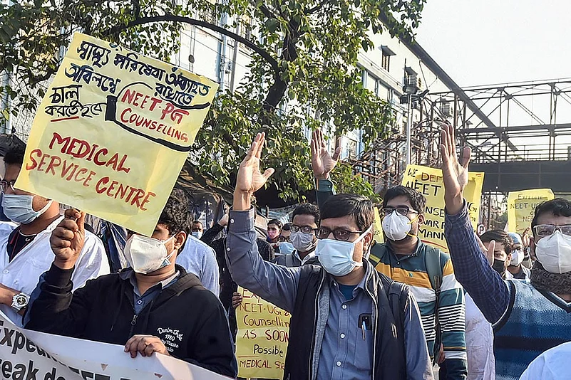 Large-scale protests have been held by resident doctors of various hospitals under the banner of the Federation of Resident Doctors' Association (FORDA) in Delhi and other parts of the country over a delay in the NEET-PG counselling, which has been postponed due to the Centre deciding to revisit the criteria for the determination of the EWS quota.