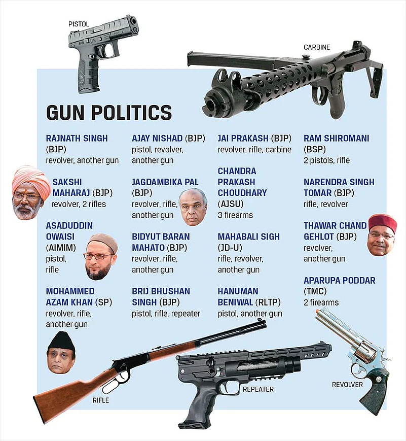 According to data collated from affidavits filed for the 2019 general elections, over 18 per cent of Lok Sabha MPs have firearms. The weapons, including both India-made and imported, cost Rs 4,000 to Rs 7 lakh as per the affidavits. “The prices must have been underestimated, though it can be ascertained only by looking at the condition of the guns,” says a senior IPS officer who didn’t wish to be identified. Jagdambika Pal (BJP), Asaduddin Owaisi (All-India Majlis-e-Ittehadul Muslimeen), Ajay Nishad (BJP), Mohammed Azam Khan (Samajwadi Party) and Ram Shiromani (BSP) are among the MPs who have more than one licensed weapon. Shiromani, who represents Uttar Pradesh’s Shrawasti constituency in the Lok Sabha, says the home minister has not cleared if the provision of two firearms is only for people applying for new licences or also for those like him who already have three licences.