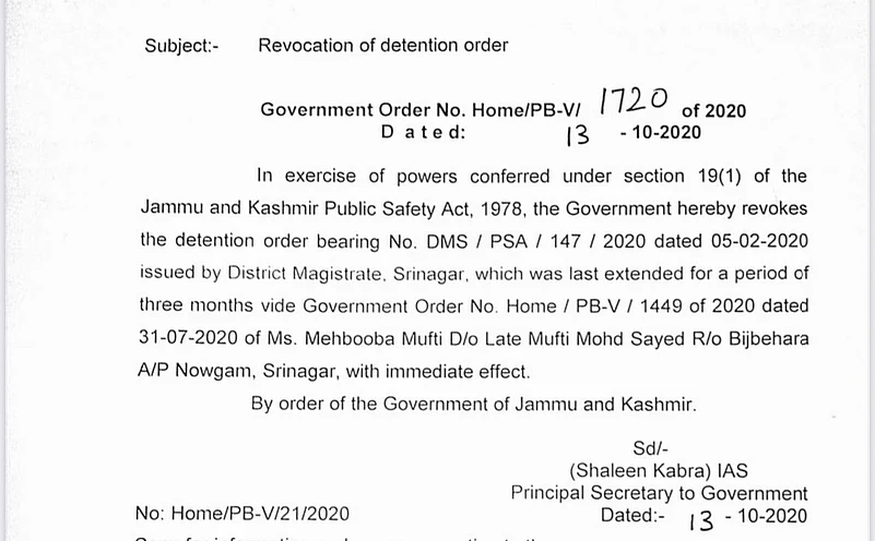 The Jammu and Kashmir government Tuesday evening revoked detention order issued against former chief minister Mehbooba Mufti.