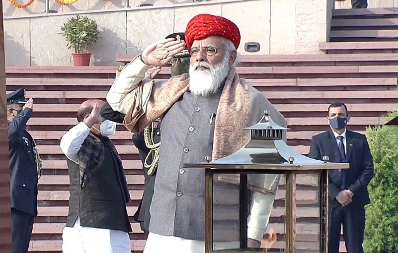 Prime Minister Narendra Modi on Tuesday donned a special Jamanagar turban on the occasion of India's 72nd Republic Day parade at Rajpath. The “halari paghdi” was gifted to him by a royal family based in Gujarat's Jamnagar district.