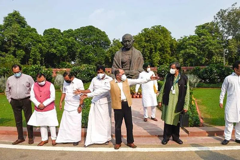 Members of the Congress walked out of the Lok Sabha and staged a protest in front of the Mahatma Gandhi statue in the Parliament House complex after they were not allowed to speak following a statement by Defence Minister Rajnath Singh on the border standoff with China in eastern Ladakh.