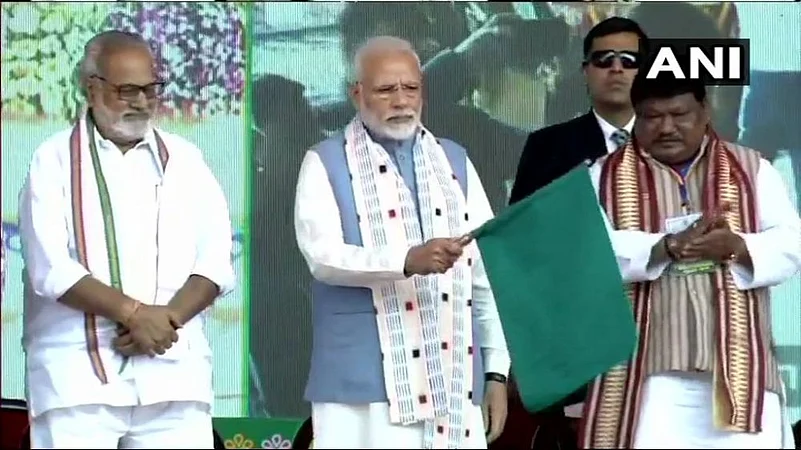 Modi flagged off a new train on Balangir-Bichhupali route which would benefit commuters of the region, besides connecting Bichhupali to Jharsuguda and Vizianagaram main line through Balangir.