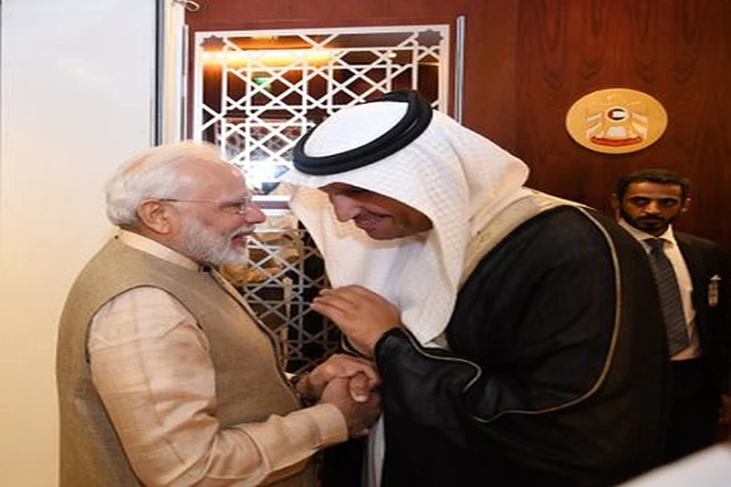 Modi reached UAE capital Abu Dhabi from Paris on Friday on the second leg of his three-nation tour to France, UAE and Bahrain.