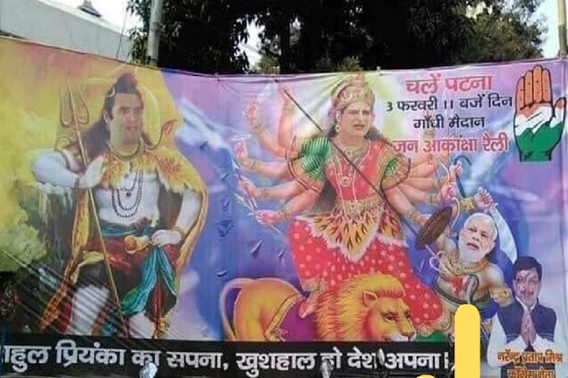 The posters, which have been allegedly put up by Congress supporters, have drawn the ire of the Bharatiya Janata Party. It also depicts Gandhi as Lord Rama and Priyanka Gandhi Vadra as Goddess Durga, who had slain the demon king Mahishasura.